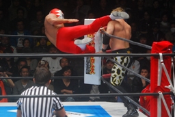 ドラダがロープを蹴ってトペ・コン・ヒーロ(右写真)。