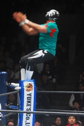 裕二郎ラリアット(左写真)、マスカラ場外エスケープ。ドラダがリングイン。