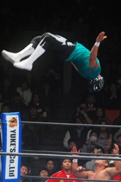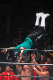 NO LIMITロープに飛んで内藤がサマーソルトドロップ、裕二郎がギロチンドロップ(右写真)、カウント2。