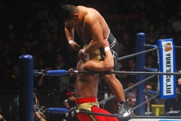 石井逆水平、ロープに振ってショルダースルー、タイガー着地。石井ガットショット、コーナーに振るがタイガー切り返す、石井は自分がバッグを外したターンバックルに背中を強打(左写真)。