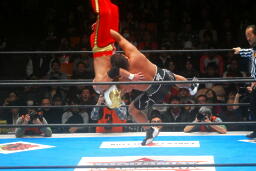 タイガー再度飛びつき十字架固め狙う、石井はブロックしてバックフリップで押しつぶす(右写真)。