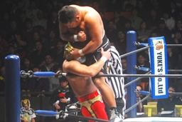 石井場外で間を取る。石井がリングに戻るとタイガーロープに飛ぶ、石井キャッチしてパワースラム(左写真)。