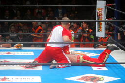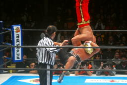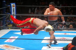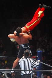タイガーはソバットからドロップキック(右写真)。5分経過。