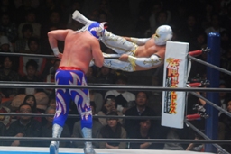 リングに戻りミスティコがロープに飛ぶ、アベルノがカウンターのドロップキック、コーナーに上る。ミスティコはジャンピングハイキック(左写真)。