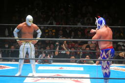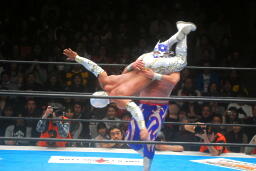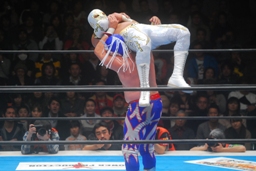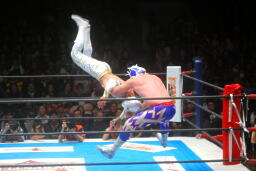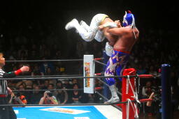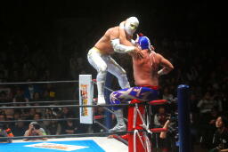 ミスティコボディスラムからトップロープに飛び乗ってスワンダイブ式のトペ・アトミコ(右写真)、カウント2。美しい。