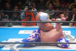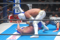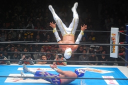 そしてその場跳びムーンサルトプレス(右写真)、カウント2。5分経過。