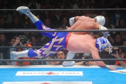 アベルノがコーナーに上ってダイブ、ミスティコは下からドロップキック(左写真)、カウント2。