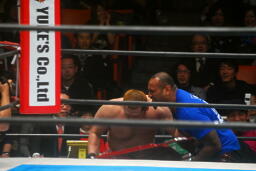 井上コーナーに振る、矢野切り返して突っ込む、井上はカウンターのキック。井上コーナーに上るが矢野は足を払って落とす(右写真)。