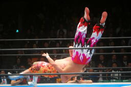 井上はロープワークで矢野を惑わせてのスピアー(左写真)、そのまま押さえ込んでカウント3。
