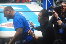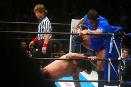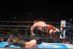 天山コーナーに上ってダイビングヘッドバット、中邑かわす(右写真)。
