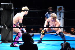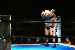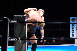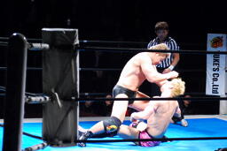 裕二郎ボディスラム、カウント2。ナックル連打(左写真)。忍張り手、裕二郎強烈な張り手返す、カウント2。5分経過。
