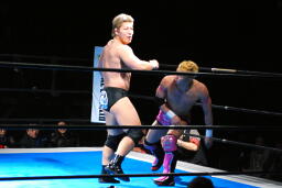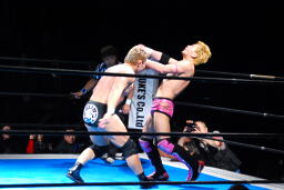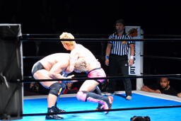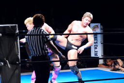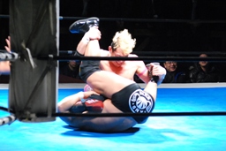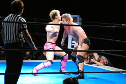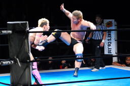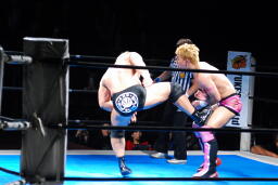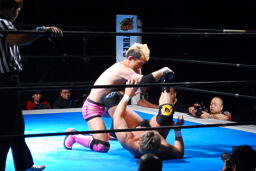忍対角線コーナーに振る、裕二郎切り返して突っ込む、忍カウンターのキックからクロスボディ(右写真)。