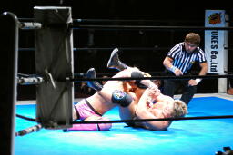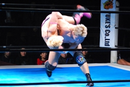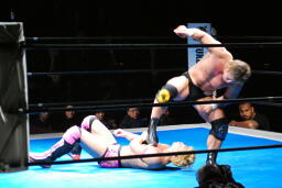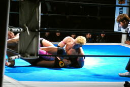 リングに戻してカバー、裕二郎1で返す。忍はボディスラムからライオンサルト(左写真)、今度はカウント2。