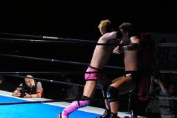 忍コーナーに詰めてガットショット、エルボー連打(左写真)。裕二郎ガットショットからエルボースタッブ、忍またガットショットから逆水平連打。