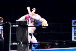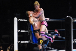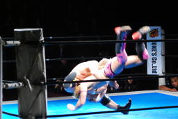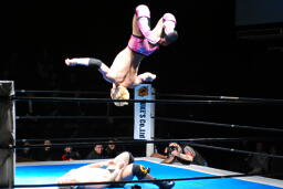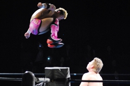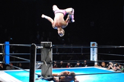 コーナーに上ってミサイルキック(左写真)、裕二郎場外転落。