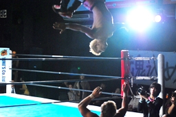 忍エプロンに出てラ・ケブラーダ(右写真)。ケブラーダのフォームの美しさは随一だなあ。