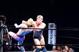 忍ロープに飛ぶ、裕二郎ビッグブーツ(右写真)。裕二郎ロープに飛ぶ、忍カウンターのSEXボンバー、これは見事に裕二郎のアゴにヒット。