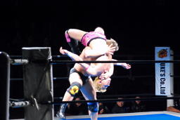 V1アームロックから十字狙う(左写真)、忍はエビ固めに、カウント1。