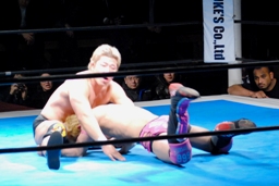 忍はSEXボンバーを予告してロープに飛ぶ、裕二郎が逆にラリアット(右写真)。