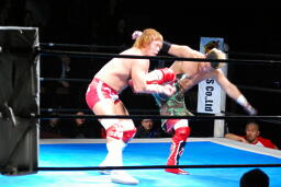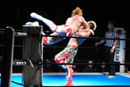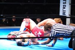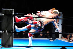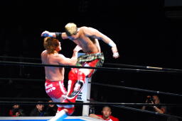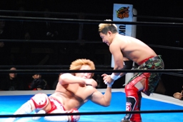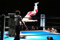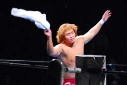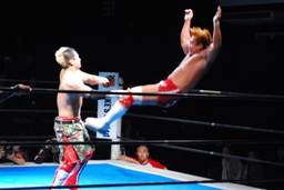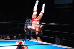 内藤ガットショット、ロープに振る、KUSHIDAハンドスプリングエルボー(右写真)、カウント2。
