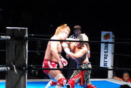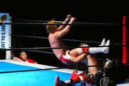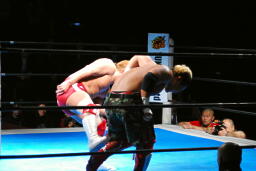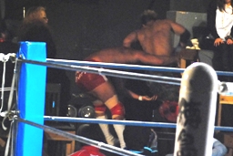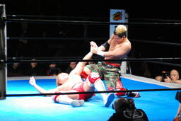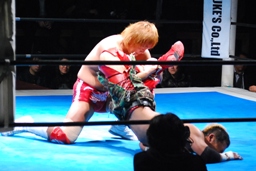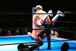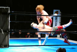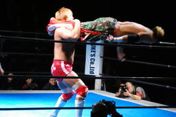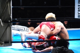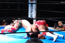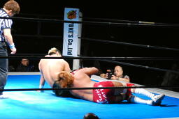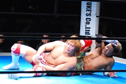 内藤ジャーマン(右写真)、形が崩れエビ固めに、カウント2。