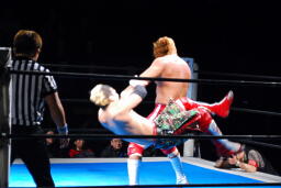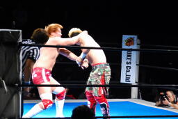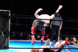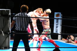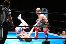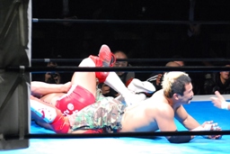 内藤がKUSHIDAをコーナーに上げる、KUSHIDAは雪崩式回転エビ固め(右写真)。ダブルノックダウン。