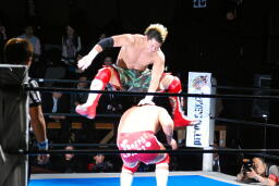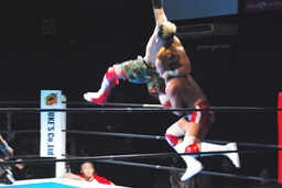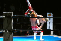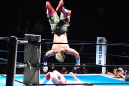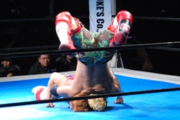 カウント18でKUSHIDAがリングに戻ると内藤は首投げからサマーソルトドロップ(左写真)、カウント2。