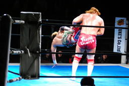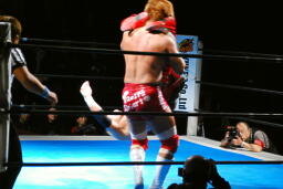 内藤低空ドロップキック連発(右写真)。5分経過。