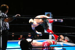 その場跳びムーンサルトプレス(右写真)、カウント2。