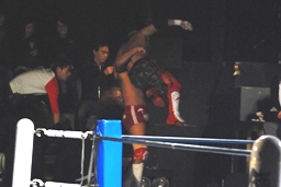 KUSHIDAコーナーに上る、内藤追いかけて捕まえると雪崩式ニークラッシャー(右写真)。15分経過。