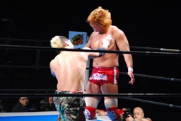 珍しく最初からTシャツを脱いだ内藤(右写真)。KUSHIDAを認めているという意思表示かな?