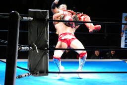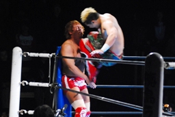 内藤すぐにコーナーに上りスターダストプレス(左写真)、カウント3。