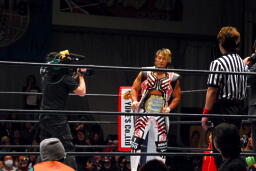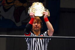 海野レフェリーがベルトを掲げる(左写真)。