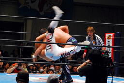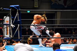 ボディスラムからセカンドコーナーに上ってサマーソルトドロップ(左写真)、カウント2。
