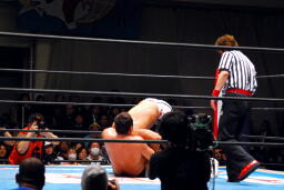 永田フロントネックロック(左写真)、棚橋首を抜いてエビ固めに、カウント2。