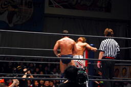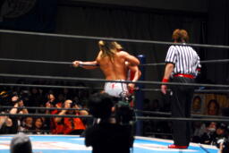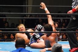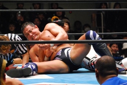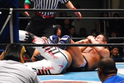 棚橋ヘッドロックからフライングメイヤー、永田ヘッドシザーズでブレーク。永田は棚橋を転がして腕を取る(右写真)、十字に。棚橋ブロック。永田は三角絞め、棚橋ロープ。5分経過。
