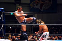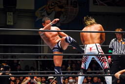 永田ヒザ十字、棚橋は立ち上がって前蹴り(右写真)。