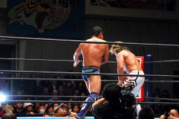 試合開始。永田ローキック、棚橋は体をロープから出す(右写真)。手四つから永田バック取る、棚橋切り返す、永田切り返す、棚橋ロープ。