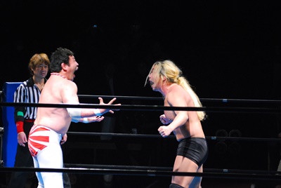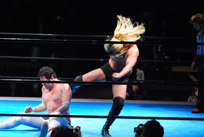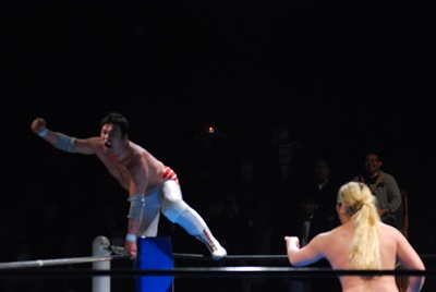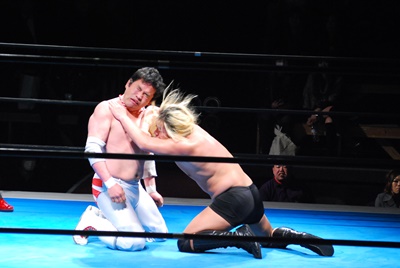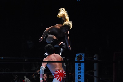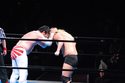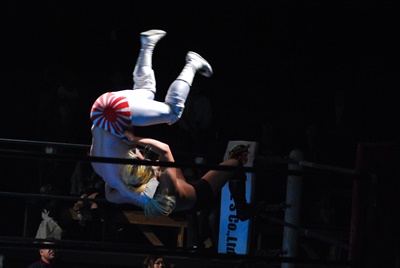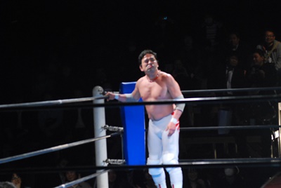 菊地が向き直ってダイビングヘッドバット狙うが大家コーナーに上って雪崩式ブレーンバスター(右写真)。