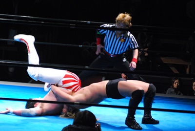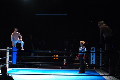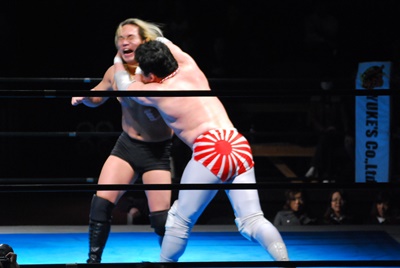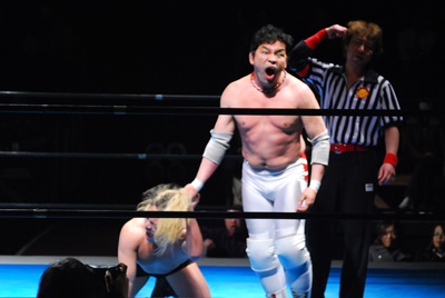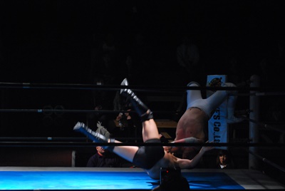 菊地は大家を花道に出して(右写真)ブレーンバスター。