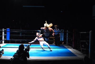 大家コーナーに上る、菊地も上ってスパイダー式フロントスープレックス(左写真)。