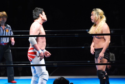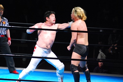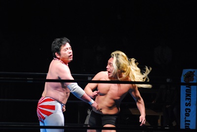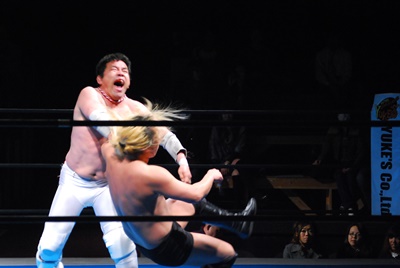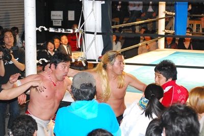 菊地がリングに降りて文句を言うと大家はミサイルキック(左写真)、菊地場外転落。