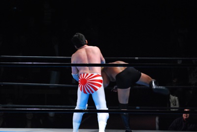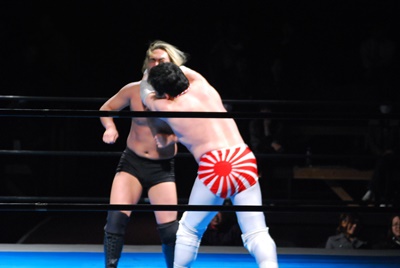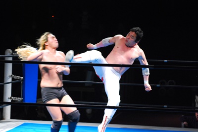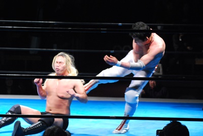 エルボーの打ち合いから菊地はロープに飛んでゼロ戦キック(左写真)、カウント2。