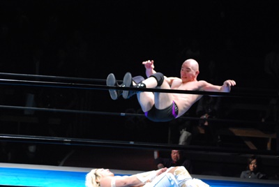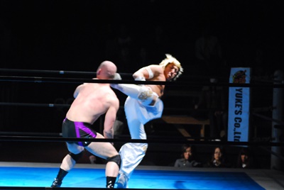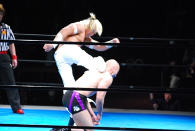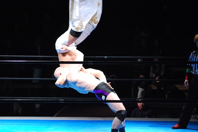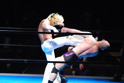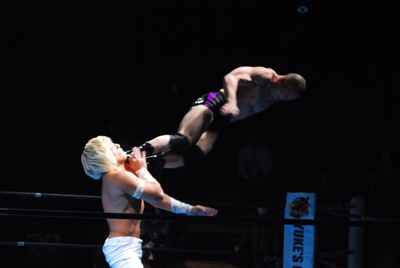 浪口ロープに詰めて逆水平、エルボー連打。ガットショット打ち合い、浪口コーナーに詰めてショルダータックル、ブレーンバスター(右写真)、カウント2。