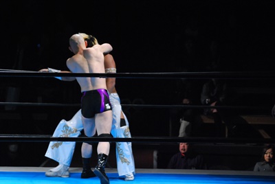 浪口ロープに詰めてエルボー(左写真)、突っ込む、タイチはショルダースルーで花道に出す。