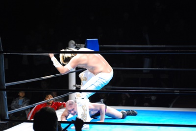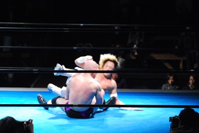 カニばさみで倒してオクラホマロール(左写真)、これもカウント2。タイチは場外に出て呼吸を整える。一旦リングに戻るがまたすぐ外に。カウント19ぎりぎりまで粘る。