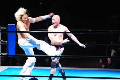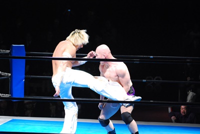 タイチ顔面キック(左写真)。ボディスラムからサッカーボールキック、カウント2。5分経過。