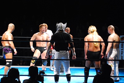 先発は「どうぞどうぞ」で内藤(左写真)、そして大家。しかしリングをぐるぐる回っただけでコンタクトないまま大家はトマトにタッチ。内藤も外道にタッチ。