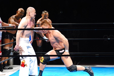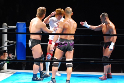 1回戦負けた選手による8人タッグマッチじゃなくてCHAOSとの8人タッグというのは意味がある(右写真)。