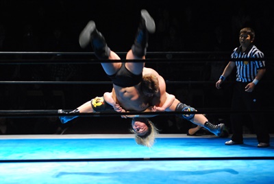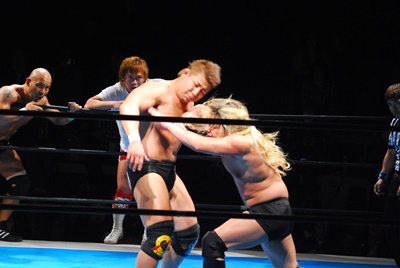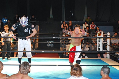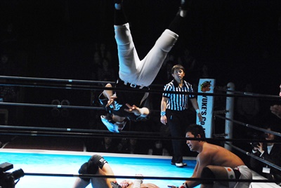 内藤逆エビ固め(左写真)、浪口ロープ。邪道にタッチ。
